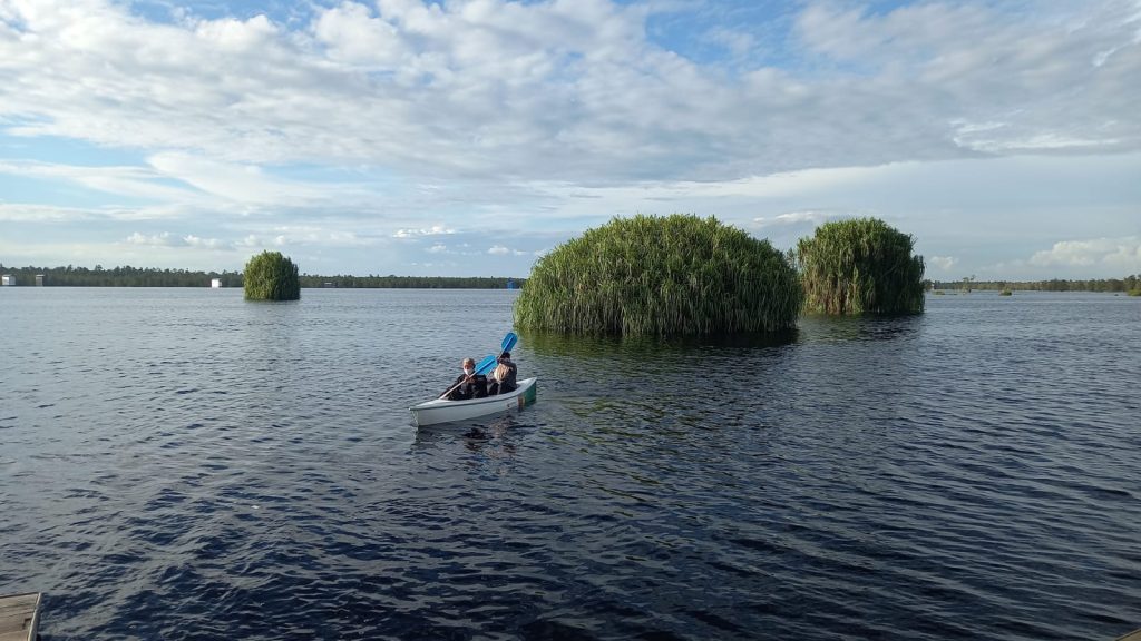 Perahu-perahu yang melintasi danau dan bangunan kayu yang menjulang tinggi memberikan pemandangan yang memikat. Hutan di sekitar danau juga dihuni oleh banyak bangau, menambah keindahan dan keanekaragaman hayati kawasan ini.