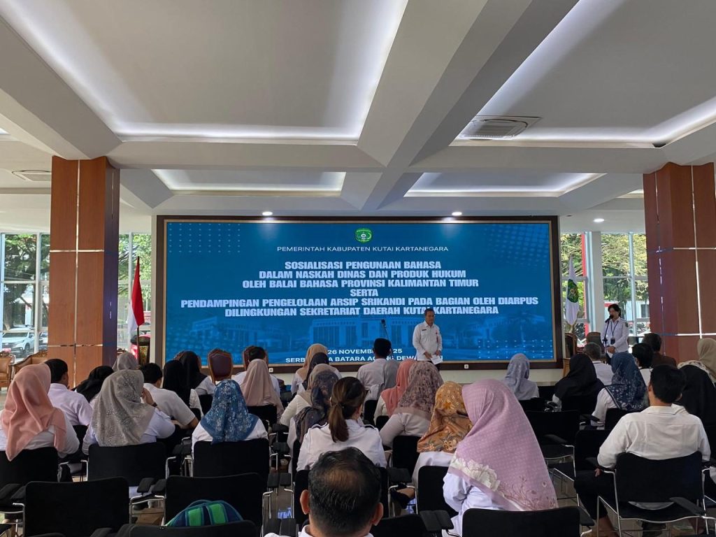 TENGGARONG – Pemerintah Kabupaten Kutai Kartanegara (Kukar) melalui Sekretariat Daerah menggelar Sosialisasi Penggunaan Bahasa dalam Naskah Dinas dan Produk Hukum serta Pengelolaan Arsip SRIKANDI. Kegiatan yang menggandeng Balai Bahasa Provinsi Kalimantan Timur itu dibuka secara resmi oleh Bupati Kukar melalui Asisten III Setkab Kukar, Dafip Haryanto, Rabu (26/11/2025).
