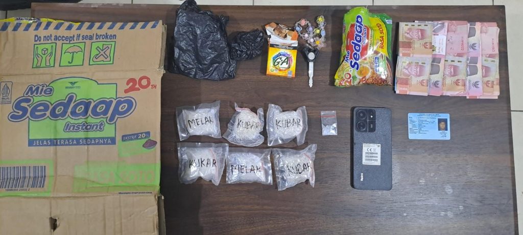 Saat penangkapan, tersangka sempat membuang sebuah plastik kresek hitam. Setelah diperiksa, plastik tersebut berisi satu bungkus mie instan yang di dalamnya terdapat satu paket sabu. Penggeledahan lanjutan menemukan sabu lainnya yang disimpan dalam bungkus rokok serta kardus mie instan.